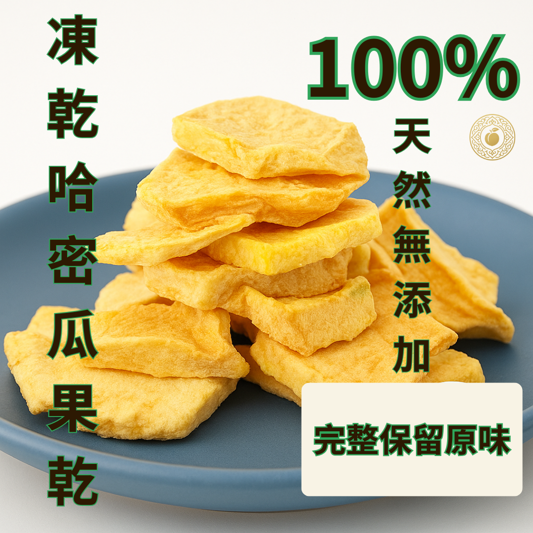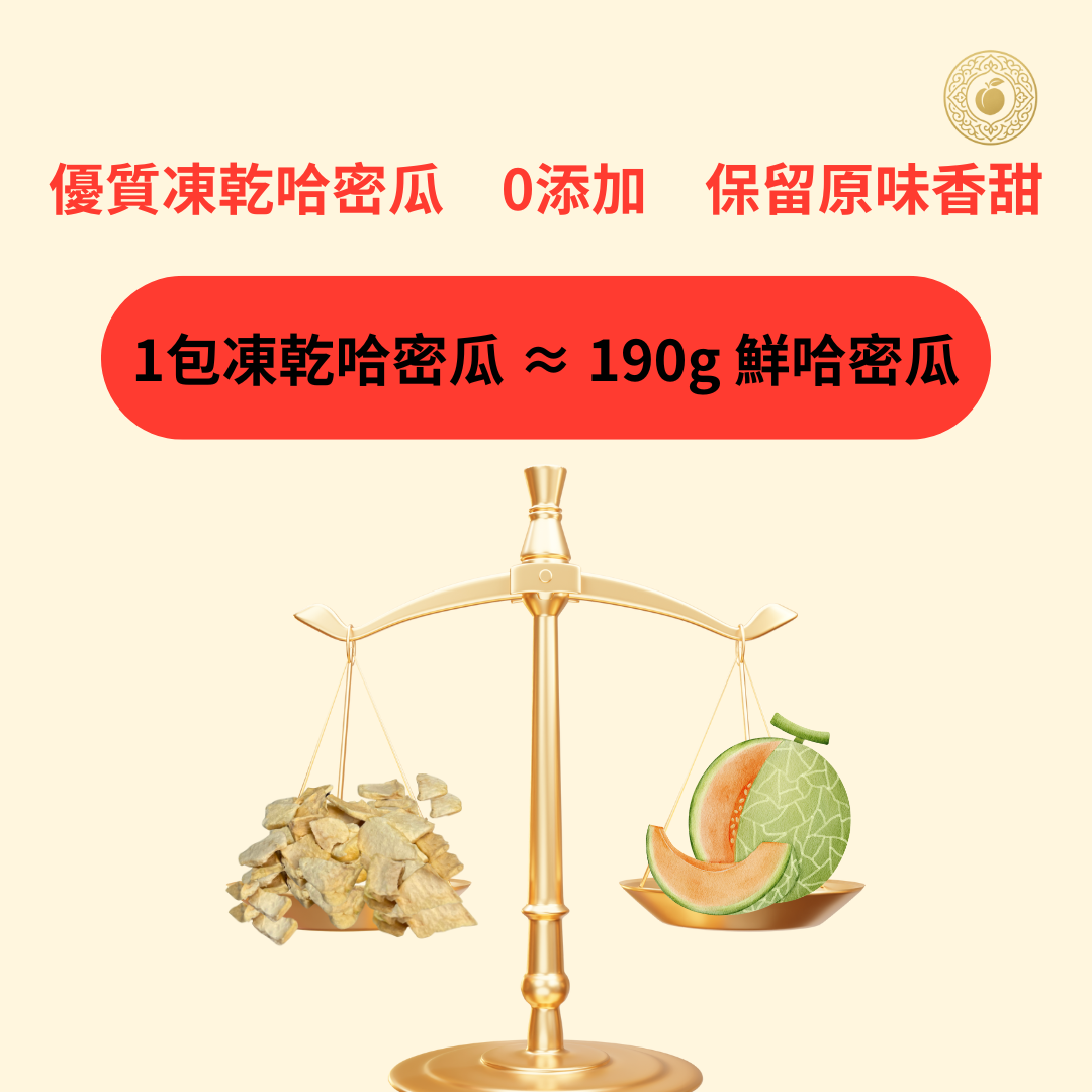 在高日照、乾燥氣候下自然成熟的哈密瓜,甜度濃縮、香氣明顯。透過冷凍乾燥技術定格新鮮瞬間,保留最純粹的水果風味。