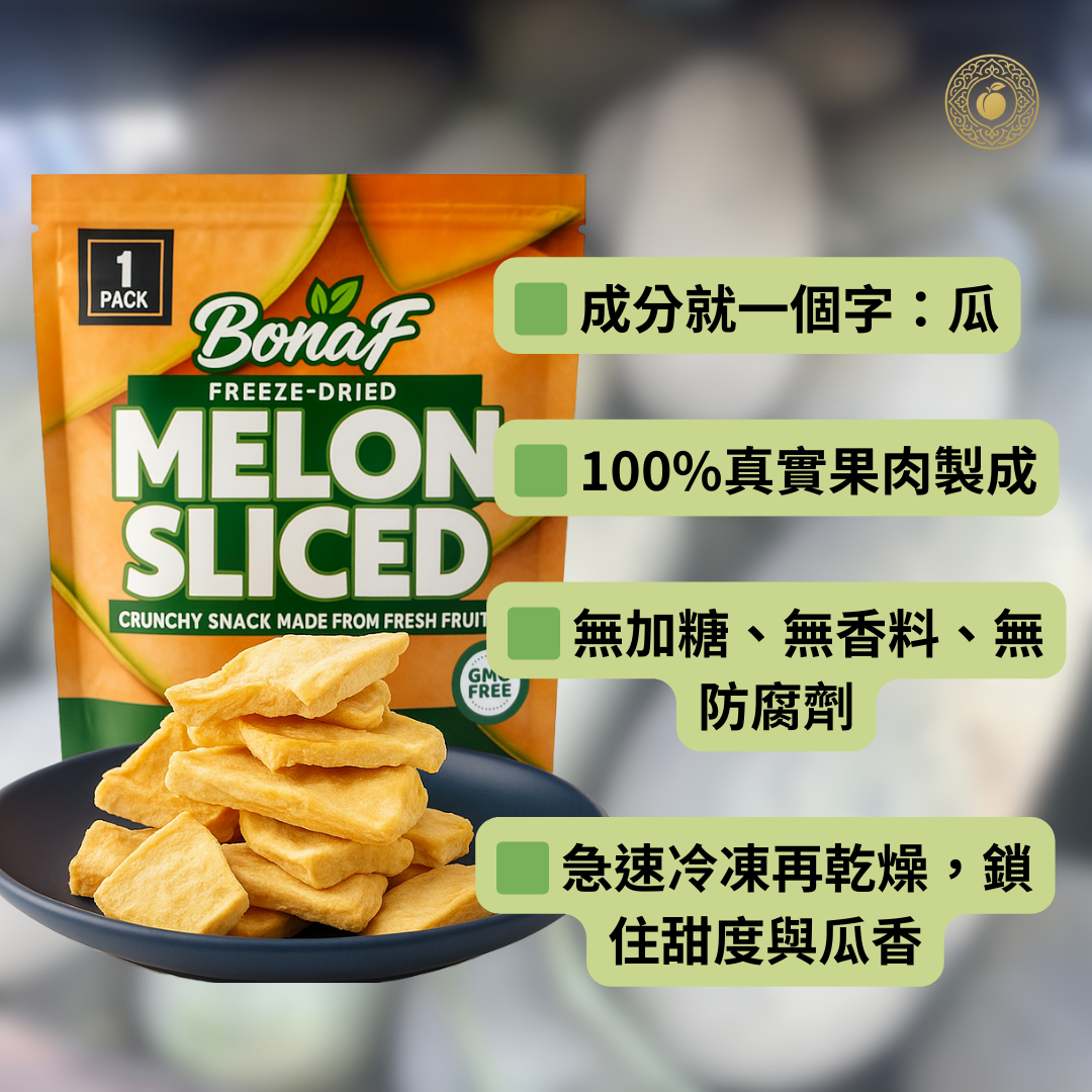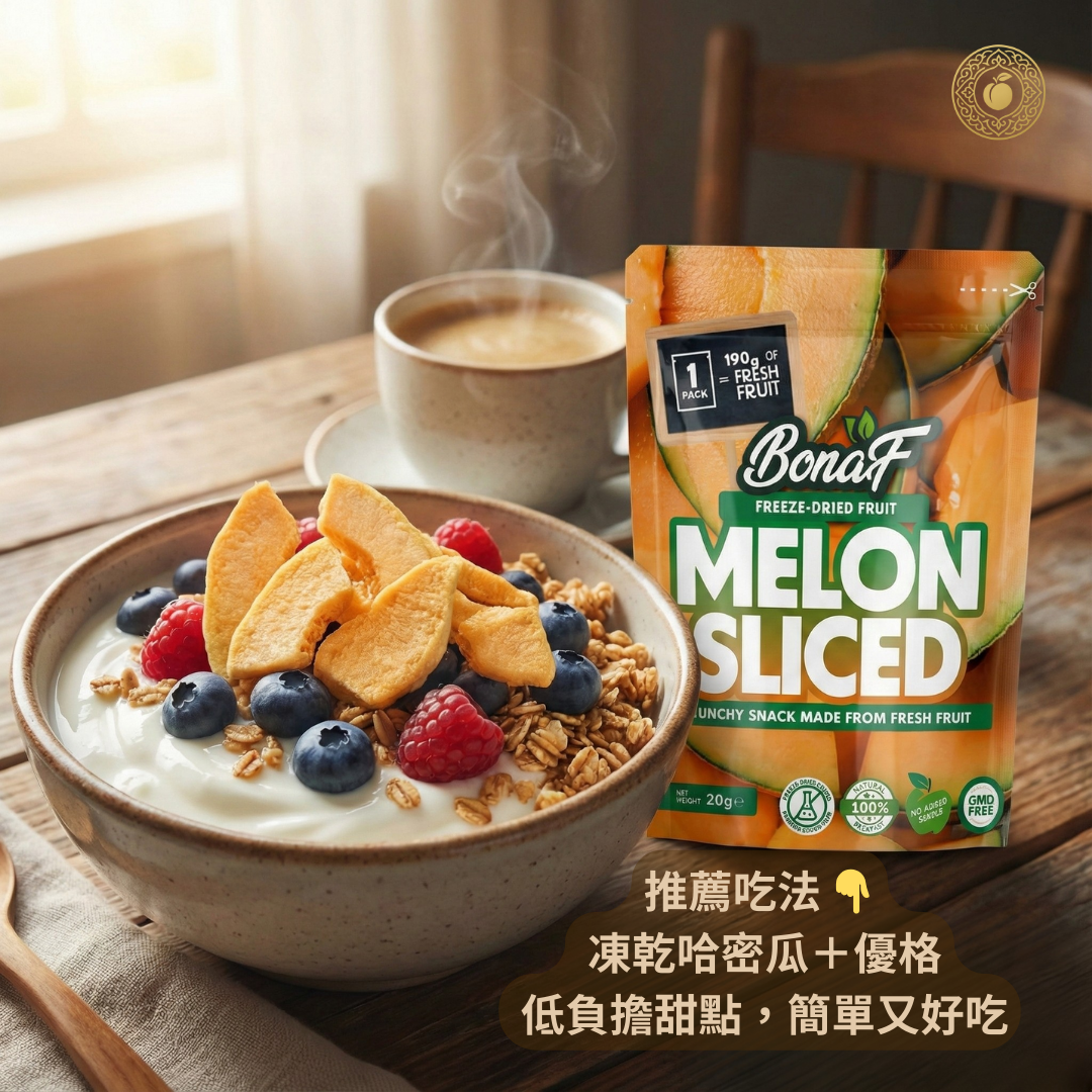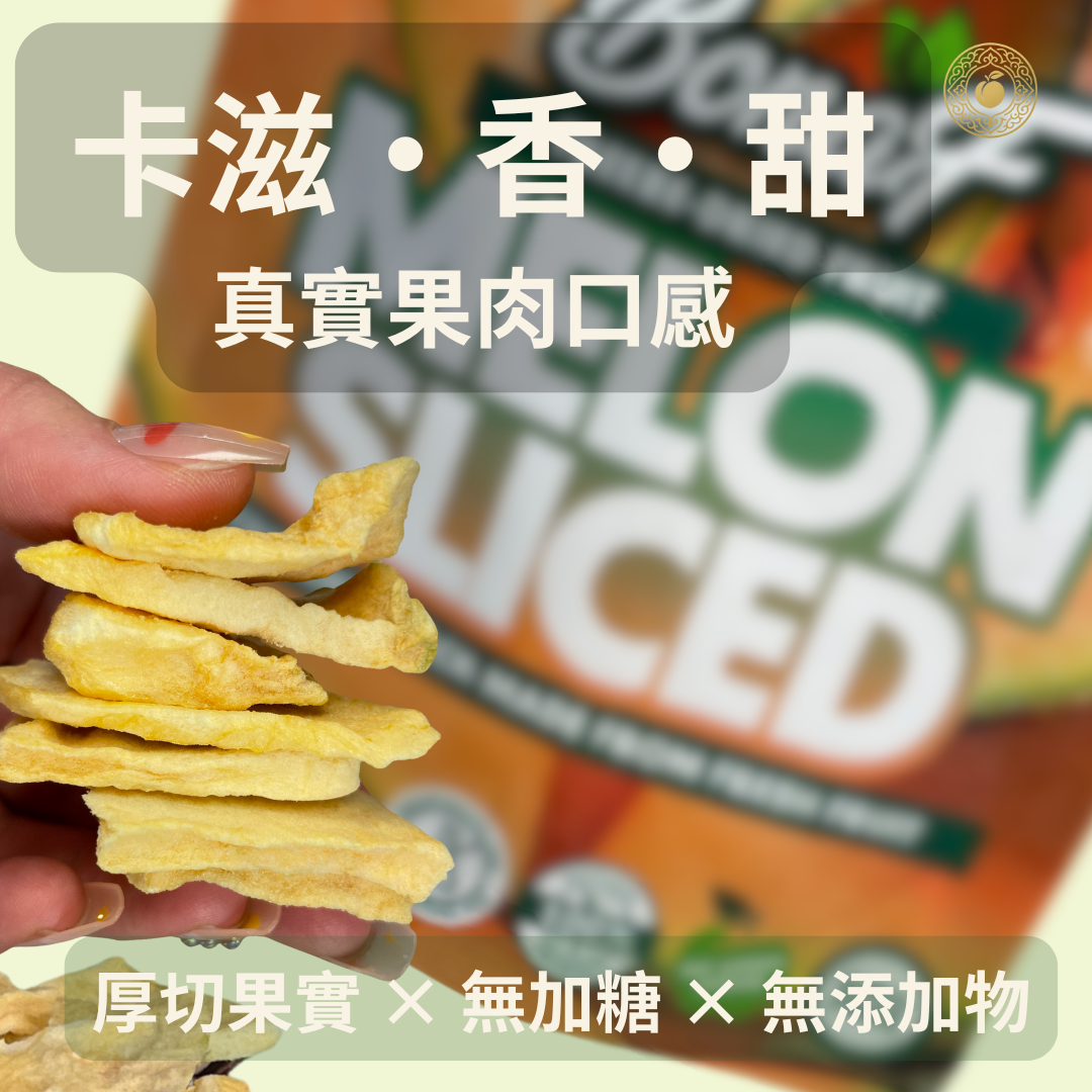 不同於一般烘焙果乾,Bonaf 凍乾哈密瓜不經高溫加工、不添加糖分與香料,口感酥脆、入口即化,散發濃郁天然果香。